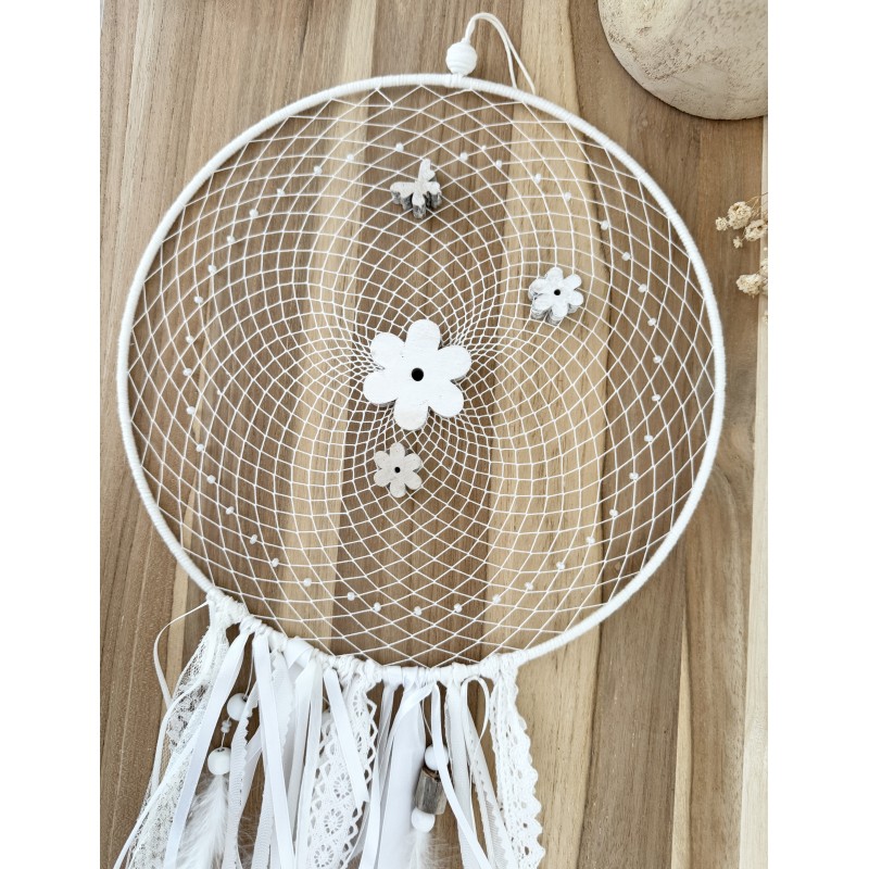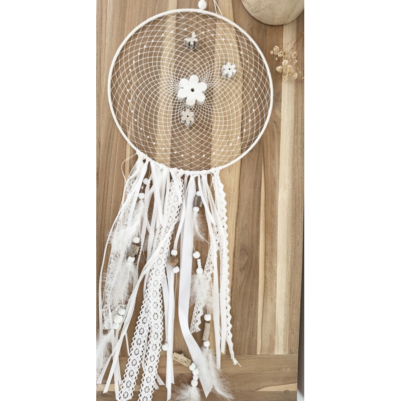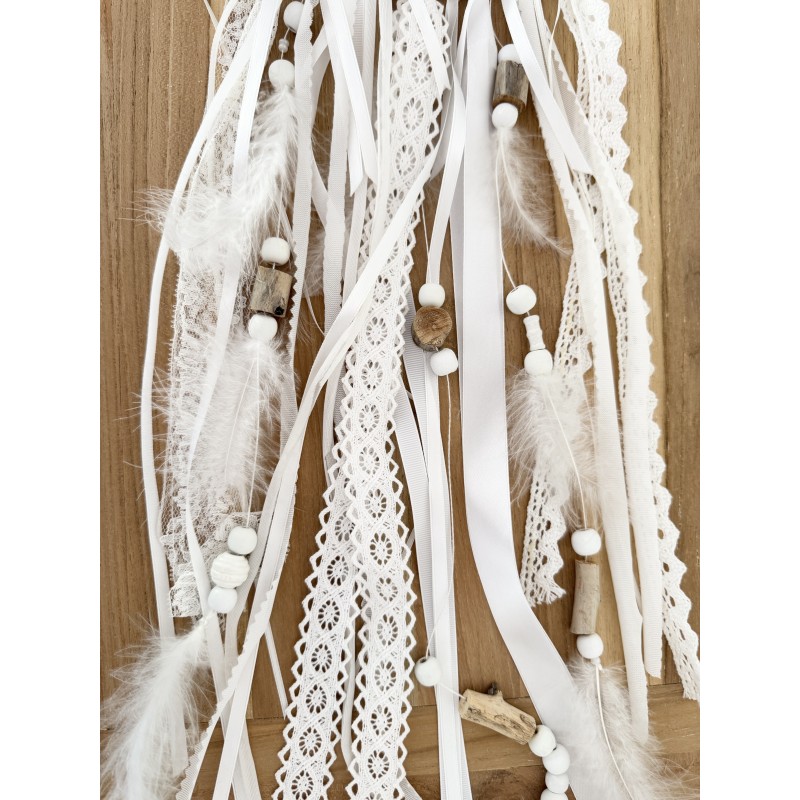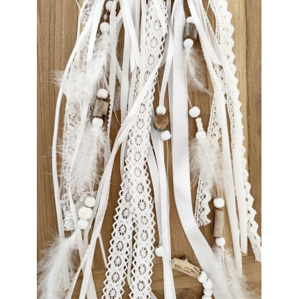 Attrape rêves grand modèle blanc, il est composé de rubans, plumes, dentelle, perles et petits sujets en bois.
