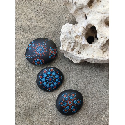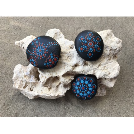 Lot de 3 galets bleus et orange, peints à la main et vernis mat, pour décorer un meuble, une étagère ou autre.