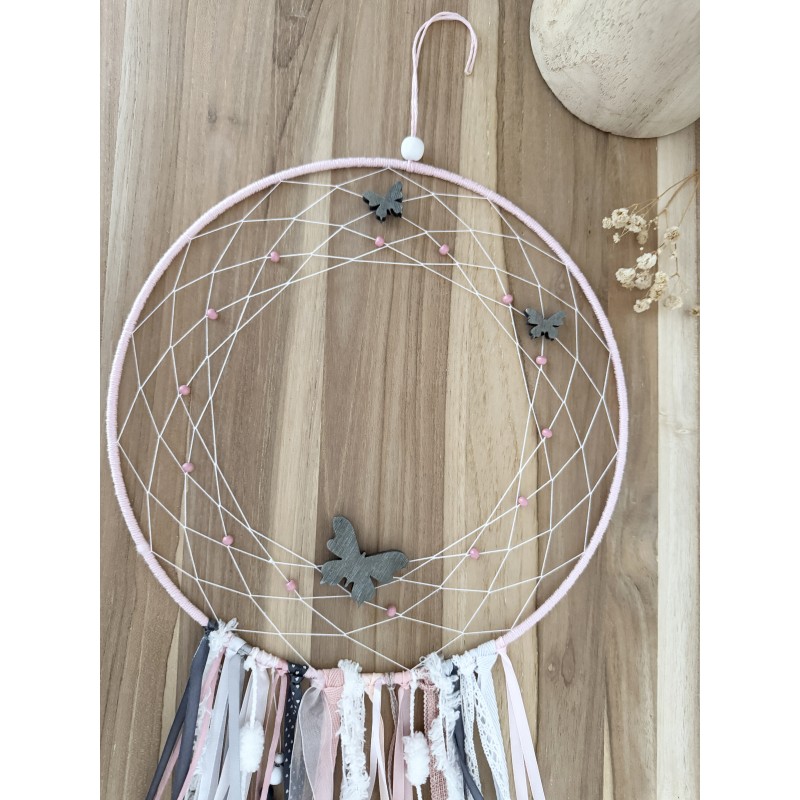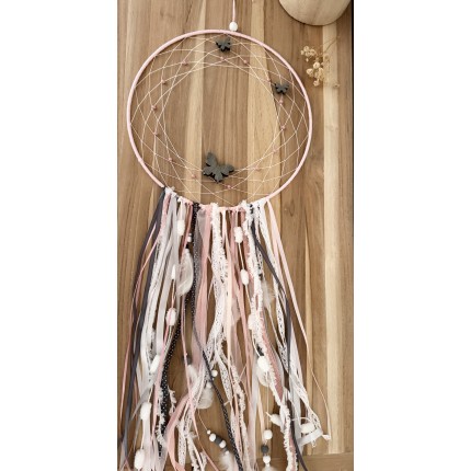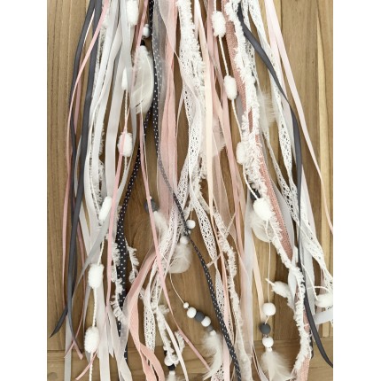 Attrape rêves grand modèle rose poudré, gris et blanc, composé pompons, rubans, plumes, perles et sujets en bois.