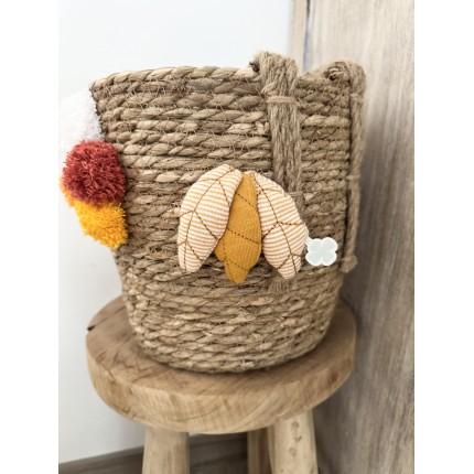 Panier de rangement en jonc de mer personnalisé avec 2 motifs en tissus et pompons, pour décorer votre chambre d'enfant.