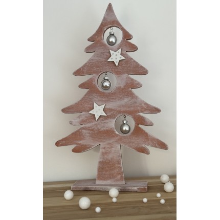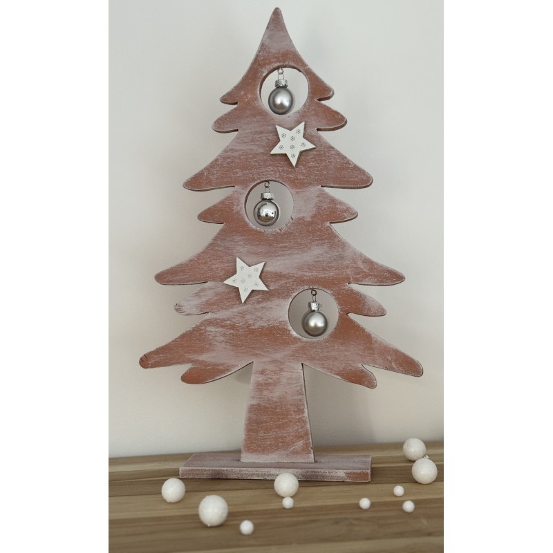 Sapin en bois, teinte orangée, patiné à la cire, décoré avec petites boules assorties et étoile en bois